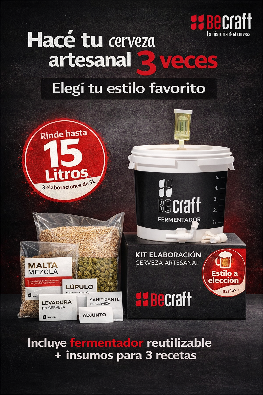 Incluye los insumos para elaborar 3 recetas de 5 litros cada una, del estilo que elijas.